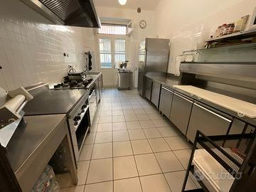 La cucina, di circa 15 mq, è completamente attrezzata e realizzata in acciaio inox, dotata di strumentazione nuova e professionale, con canna fumaria certificata a tetto, sensore gas con elettrovalvola e prese d'aria per il ricambio naturale. Sono inoltre presenti magazzino provviste, spogliatoio e servizio igienico per il personale.