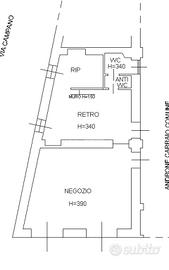 INTERNO: il negozio è composto da un ingresso con un ampio locale con le due vetrine, il disimpegno, due ulteriori locali e il bagno.