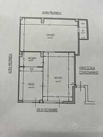 L'immobile commerciale,con possibilità di cambio di destinazione d'uso,in abitativo, è suddiviso come foto allegata,dotato di due ampie vetrate protette da serrande elettriche,impianto di riscaldamento ed aria condizionata,allarme ed un bagno con doccia.