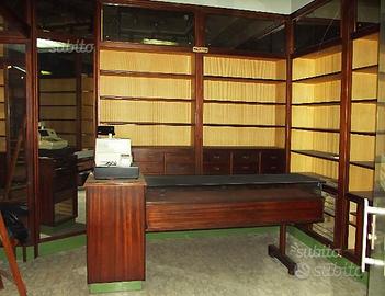 Arredato su misura fronte strada in legno e specchi fornito di numerose cassettiere, vetrinette e banconi espositivi derivanti da precedente attività di cartolibreria, merceria, profumeria e abbigliamento come da foto.