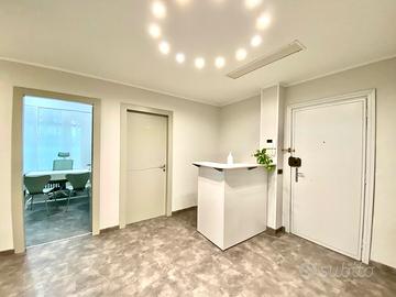 Lo studio dispone di area reception, ampia sala d'attesa/conferenza, 4 stanze visita, area relax/spogliatoio, bagno pazienti e bagno personale.