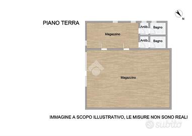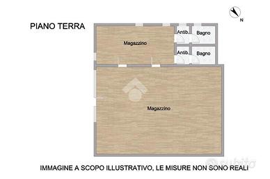 L'immobile, dotato di ingresso indipendente al piano terra, si sviluppa in un unico ambiente, con facilità di accesso e di manovra per carico e scarico. Completa la proprietà due depositi e due bagni di servizio dotati di antibagno.