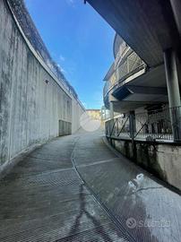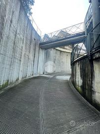 Lo spazio è raggiungibile sia tramite passaggio pedonale che carrabile e l'accesso è delimitato da una basculante automatica che separa l'area adibita ai parcheggi pubblici da quella dei garage privati.