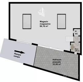 Il magazzino si trova in via Adige a Merano e può essere consegnato immediatamente. Ha una superficie netta di circa 99 m² e dispone di un piccolo ufficio e di un WC. Direttamente di fronte all'ingresso del magazzino si trova un piccolo piazzale di circa 32 m². L'accesso avviene tramite una rampa.