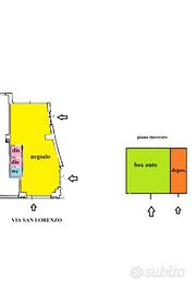 Il locale è composto da un unico luminoso ambiente in ottimo stato di manutenzione ed in parte piastrellato, idoneo quindi per attività legate all'area alimentare. E' presente impianto elettrico da 380V, impianto di videosorveglianza e oltre all'ingresso principale da Via San Lorenzo anche altri due accessi. Il riscaldamento e la climatizzazione autonomi ad aria assicurano un comfort ottimale in ogni stagione. Completano la proprietà un box auto di 25 mq, una caratteristica rara e preziosa in questa zona centrale, e un locale uso deposito idoneo per lo stoccaggio di prodotti alimentari confezionati.