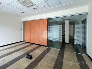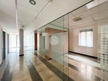 Il piano terra si presenta come un ampio open space, con una prima zona uffici suddivisa in tre ambienti. Questa area è collegata tramite un corridoio a una seconda zona uffici, composta da ulteriori tre locali delimitati da pareti in vetro.