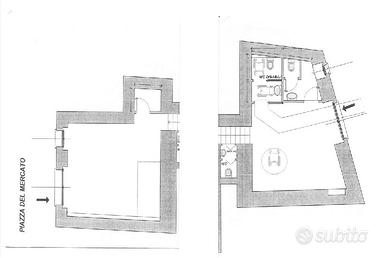 La soluzione è composta da due locali: il primo affaccia direttamente sulla piazza mentre il secondo affaccia sul vicolo adiacente, posizionato ad un livello leggermente più basso e internamente collegati da un corridoio dove è posta la scala ed un servizio ad uso del personale.