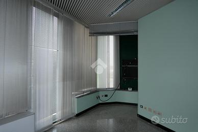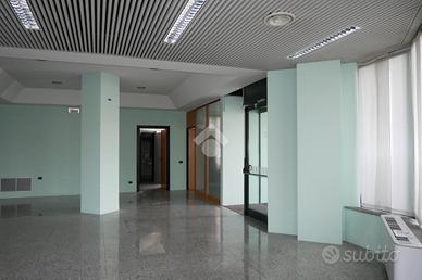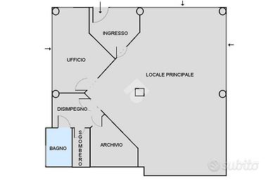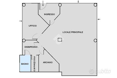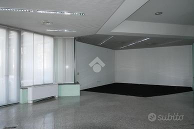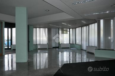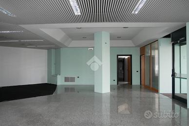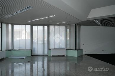Internamente attualmente è un ampio locale open space; è stato creato un piccolo ufficio privato sul lato ovest con una parete mobile in vetro. Sul retro invece troviamo un disimpegno che permettere di accedere ad un locale archivio, ad un piccolo locale sgombero ed al bagno.