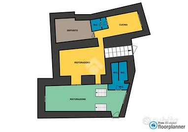 Un comodo e luminoso ingresso conduce sia ad un bagno costituito da doppi servizi e antibagno che alla sala principale da cui si accede tramite alcuni scalini. L'immobile è composto da un'altra stanza che potrebbe essere adibita a sala ristorativa. Le due stanze retrostanti sono state destinate per ospitare un'ampia cucina, dotata di canna fumaria, che permette di disporre tutti gli utensili e strumenti di cui l'attività necessita,un bagno utile al personale e una spaziosa zona deposito in cui poter disporre tutte le riforniture.