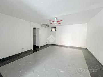 La soluzione proposta in locazione ha una superficie utile di circa 45 metri quadrati ed è situata al piano terra di una struttura condominiale che si sviluppa su tre livelli. Il locale si presenta come un ampio open space reso particolarmente luminoso grazie alla presenza di una vetrina con affaccio esterno. L'immobile è provvisto dell'impianto elettrico, di illuminazione, di riscaldamento e condizionamento. A completare la soluzione è la presenza di un servizio igienico privato.