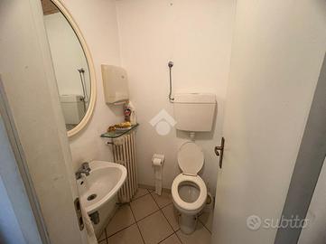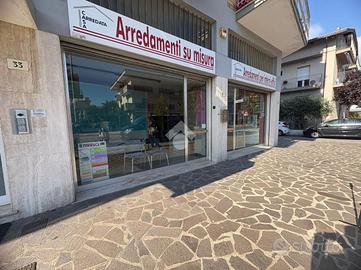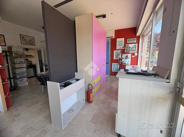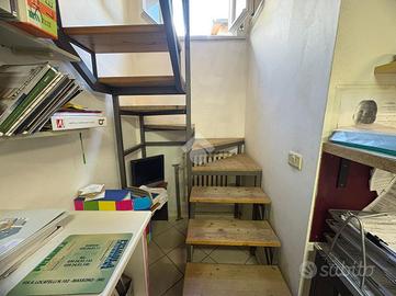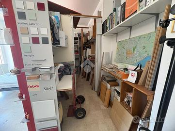 Sul retro del negozio si trova un vano ad uso ufficio con servizi e una zona soppalcata.