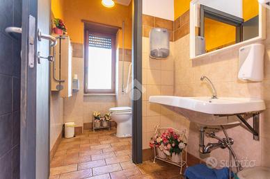 Tramite pochi gradini si accede a una zona rialzata composta da due ambienti distinti, uno dei quali può essere adibito a ufficio privato, studio, deposito o magazzino, mentre l'altro ospita un locale servizio dotato di doppi servizi igienici con antibagno, ideale per rispondere alle esigenze di attività aperte al pubblico o con personale.