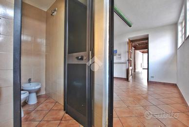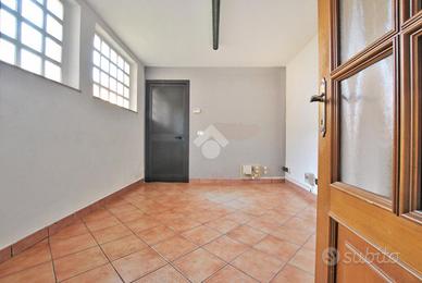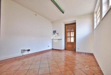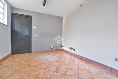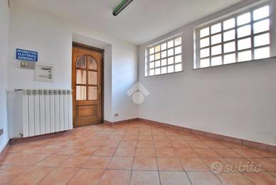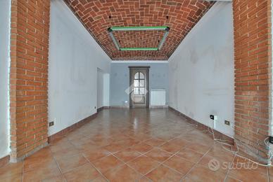 Il primo ambiente, dalle dimensioni maggiori, spicca per i dettagli rustici che impreziosiscono i soffitti e le pareti: le volte e le colonne in mattoni sabbiati a vista regalano un'atmosfera calda e accogliente, aggiungendo anche un tocco raffinato. Due grandi blocchi in vetrocemento illuminano la stanza più piccola, collocata sul retro e adibibile a studio o archivio, comunicante, a sua volta, con i servizi igienici preceduti da un antibagno.