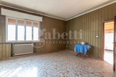 Al primo piano, con accesso esterno indipendente, si trova un appartamento da ristrutturare, composto da zona giorno e cucina abitabile separate, tre camere matrimoniali, bagno e sottotetto da sfruttare secondo le proprie esigenze.