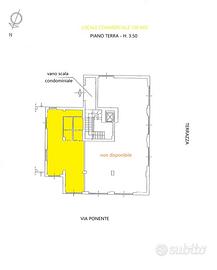 Con una superficie di 100 mq, questo spazio offre un ampio open space con un'altezza di 3,50 metri, bagno con anti-bagno, 2 vetrine con affaccio diretto su strada (via Ponente), 2 vetrine con affaccio sul marciapiede interno, che separa la palazzina "A" dalla palazzina "B", ed una finestra posteriore che affaccia sul cortile condominiale.