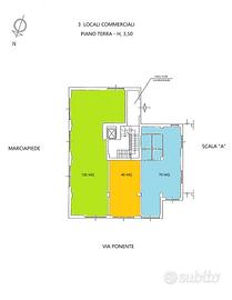 "2" locale di mq 70 composto da open space con doppi servizi dotati di anti-bagno, 2 vetrine su Via Ponente, 2 vetrine su marciapiede interno che separa la palazzina "A" dalla palazzina "B", ed una finestra sulla parte posteriore che affaccia sul cortile interno;