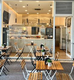 Arredamento: incluso nel prezzo (tavoli, sedie, vetrine complete refrigerate/riscaldate, banco frigo a doppio ripiano con 3 porte).