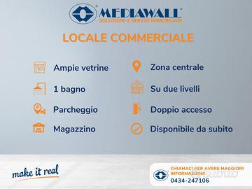 (Riferimento: BR-110-NV) Maniago (Rif. BR-110-NV) LOCALE COMMERCIALE A DUE PASSI DA PIAZZA ITALIA - A ridosso del centro, con comodo parcheggio antistante, offriamo in vendita questo ampio locale commerciale con ottima visibilità, ampie vetrine e doppio accesso, che si sviluppa su due livelli collegati da una scala interna. Al piano strada troviamo un ampio locale open space da cui si accede ai doppi servizi e a due ulteriori vani destinati in precedenza a locali cucina e preparazione vivande che possono beneficiare di un secondo accesso più defilato che non crea interferenze con l'attività e rende agevole il carico e lo scarico della merce. Il piano interrato che è raggiungibile sia da una comoda scala interna che dallo spazio condominiale, riceve aria e luce attraverso le bocche di lupo e dispone di un ampio magazzino, locale spogliatoio e ampio bagno con antibagno per il personale. Il locale si presta da subito ad essere utilizzato per attività di bar e ristorazione ma è facilmente riconvertibile a diverso utilizzo sia di natura commerciale che direzionale, potendo beneficiare tra l'altro dell'assenza di barriere architettoniche. Disponibilità di poter aggiungere alla proprietà nello stesso stabile due comodi box auto con prezzo a parte. L'immobile è contiguo ad altro ampio locale commerciale eventualmente facilmente collegabile in caso di necessità di ampliamento. Ottima opportunità anche per investimento, Disponibilità immediata.