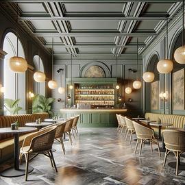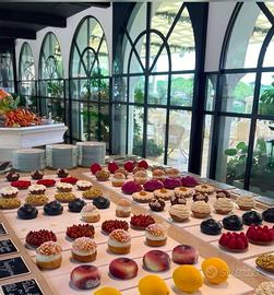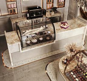 Al piano terra di mq 100 c. a, troviamo 20 coperti c. a. ed un meraviglioso bancone attrezzato con vetrine espositive per la zona caffetteria, gastronomia e gelateria, che funge da cornice a questa location fortemente amata dai suoi innumerevoli clienti.