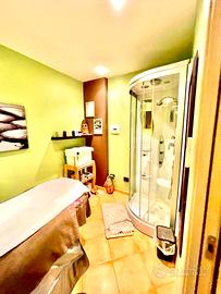 1 cabina di coppia per trattamenti estetici e massaggi con doccia emozionale di coppia rivestita in pietra vera, doccia solare con pedana vibrante e sistema brizer e specchiera per zona trucco,angolo del the' e tisane con tisaniera,