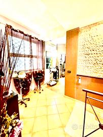 - Piano Inferiore, Ingresso su reception con numero 2 divanetti in pelle,sfondo in pietra naturale, disimpegno per giubbotti, cabina pedicure con poltrona estensibile, alzabile e regolabile, mobiletto porta attrezzi , sala parrucchieri n°4 postazioni per capelli, area lavaggi con parete d'acqua e