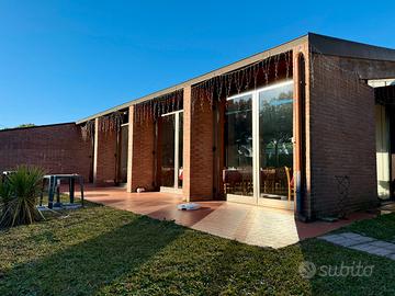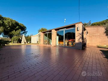 L'ingresso principale conduce, sul lato sinistro, a una luminosa veranda a vetri di 117 mq, dotata di servizi igienici e caratterizzata da un tetto a falde con travi a vista, tipico delle strutture rustiche.
