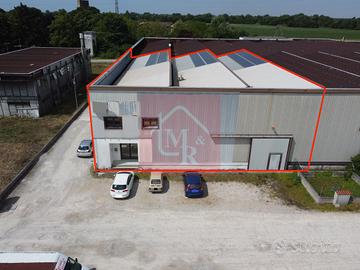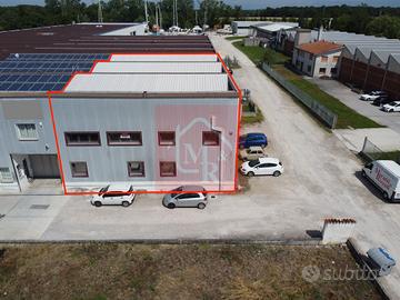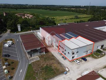 Porzione di CAPANNONE a due piani fuori terra, consistente in una unità immobiliare con annessa corte esclusiva di pertinenza a due lati. L'unità immobiliare, ristrutturata nel 2006, fa parte di un più ampio complesso artigianale/produttivo, situato nella zona di Cervignano del Friuli, così composta: al piano terra il grande deposito, di 210mq, per montaggio o stoccaggio merce con doppia altezza, spogliatoi con servizi igenici e locale caldaia; dal deposito accedi direttamente al blocco uffici sviluppato su due piani, al piano tera trovi un'ampia sala finestrata ed una sala riunioni cieca; il primo piano, raggiungibile grazie alla scala interna, è suddiviso in due grandi ambienti divisi da una parete attrezzata, in più trovi una piccola cucina ed i servizi. L'immobile in oggetto è ubicato in una posizione geograficamente favorevole per il tipo di utilizzo a cui è destinato grazie alla vicinanza dell'interporto scalo ferroviario di Cervignano del Friuli, di importanza strategica ed unica struttura interportuale della regione. I'immobile necessita di una manutenzione alla copertura causa infiltrazione d'acqua, portando il deterioramento ai pannelli del controsoffitto in alcuni punti del primo piano, come anche la parete in corrispondenza dei serramenti risulta danneggiata con il distaccamento dell'intonaco sempre causa infiltrazione. Il riscaldamento a gas metano, l'impianto di raffrescamento ed il sistema d'allarme necessitano di una manutenzione generale.