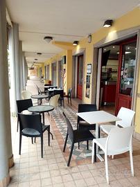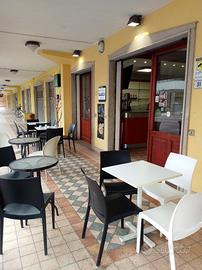 Porticato di proprietà dove poter inserire tavoli e sedie da esterno, 2 vetrine fronte strada, sala interna con ampio bancone bar, antibagno e bagno a norma per i diversamente abili, deposito, antibagno e bagno dipendenti.