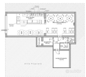 Inoltre, avrete a disposizione un magazzino di 12 mq per lo stoccaggio degli ingredienti e delle forniture necessarie per gestire al meglio la vostra attività. Gli spazi sono ben organizzati e ottimizzati per massimizzare l'efficienza operativa.