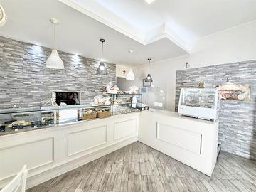 Area vendita e accoglienza clienti, ampia e luminosa, dotata di bancone vetrina refrigerato, zona cassa, tavolini per consumo sul posto e arredo contemporaneo.
