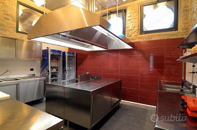 o Cucina attrezzata con: fuochi, forno, friggitrici, celle frigo, abbattitore, impastatrice, lavaggio, ecc.