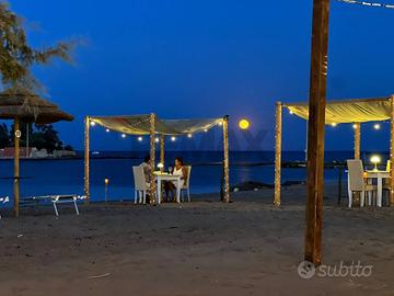 L'ampia sala esterna è arredata con gusto e cura dei dettagli, dotata di tavoli e sedie, offre la possibilità di pranzare o cenare all'aperto godendo di una piacevole brezza marina. Il ristorante dispone di una cucina completamente attrezzata e di uno spazioso bancone bar, ideale per la preparazione di aperitivi e cocktail da gustare al tramonto.