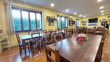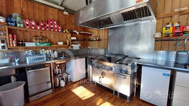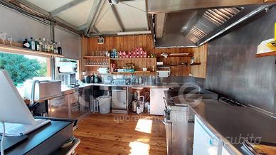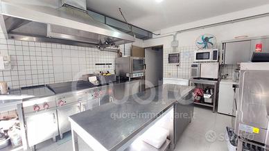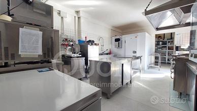 La cucina interna, a servizio delle due sale, è molto ben equipaggiata, con attrezzatura in acciaio inox, con accesso indipendente e recentemente ri-piastrellata, pronta alluso per qualsiasi tipologia di servizio. Ospita anche due celle positive, due magazzini e prese da 220 e 380 V.