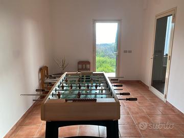 All'interno della sala troverete tavoli, sedie, giochi da tavola e una cassa bluetooth per la musica. L'altra sala è fornita di un calcio-balilla. I locali si trovano all'interno di una villa immersa nel verde con ampi spazi esterni. La sala è adatta per eventi, ricorrenze, compleanni, meeting aziendali e riunioni. L'ambiente può ospitare tranquillamente una ventina di persone. Possiamo fornire tovagliato, piatti, bicchieri e posate. La cucina è fornita di tutta l'attrezzatura necessaria per cucinare. Inoltre è disponibile un barbecue a carbone o carbonella per gustose grigliate all"aperto.