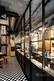 Ampia sala che ospita 20 coperti c.a. con tavoli e sgabelli alti.