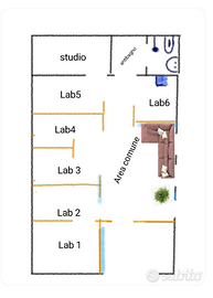 Il laboratorio é suddiviso in postazioni aperte diverse di 3 4 5 6 m2 e ognuno potrá occuparla mensilmente e sará artefice dell'organizzazione del suo laboratorio.