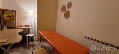 - Stanza con lettino: ideale per trattamenti manuali. Dotata di lettino regolabile, split caldo/freddo, tappeto, lampada di sale, fontana, sedia cliente, sgabello e mensole.