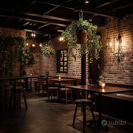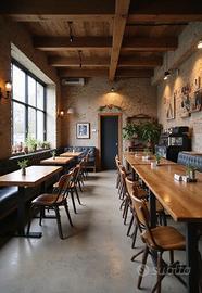 Entrando veniamo accolti da una doppia sala volta ad ospitare 95 coperti interni c. a. , con la zona cassa e bancone beverage attrezzato.