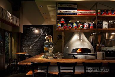 Meravigliosa zona pizzeria con forno Moretti a due bocche e bancone frigo per la preparazione della pizza.