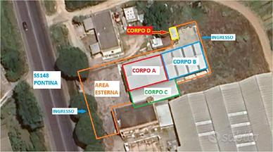 Rif: B78428 (193417236) - Locale commerciale con depositi all'asta a Sabaudia (LT), in Strada Regionale 148 Pontina. La proprietà comprende una superficie coperta di 410 mq e un'area esterna recintata di circa 1.450 mq, in parte asfaltata e in parte cementata. L'immobile è suddiviso in quattro corpi di fabbrica: - Corpo A: edificio in muratura di 90 mq con copertura a padiglione, due locali commerciali indipendenti e serrande motorizzate. - Corpo B: capannone in struttura metallica con sei capriate, copertura a doppia falda e chiusure parziali su tre lati. Dispone di due porte scorrevoli a tutt'altezza e di un volume interno su due livelli con servizi igienici al piano terra e archivio al primo. - Corpo C: capannone metallico con pilastri in acciaio e copertura a padiglione. - Corpo D: piccola struttura metallica isolata di 2,20 x 3,80 m, altezza 2,00 m. I Corpi A e B presentano difformità urbanistiche; i Corpi C e D sono privi di titolo edilizio e richiedono demolizione per il ripristino della conformità. L'area esterna ha inoltre una conformazione diversa da quella catastale. Per maggiori informazioni si invita a consultare il sito www.gobidreal.it . - Classe: B - IPE: 175.00 kWh/mc anno