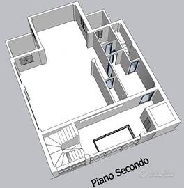 - Piano Secondo: composto da un unico ufficio open-space di circa 84 mq ed ad una sala di attesa di circa 12 mq che permette ad un wc con anti-wc per circa 5 mq;