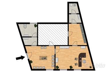Viene lasciato parzialmente arredato, con mobili adatti a studio medico o studio professionale.