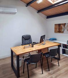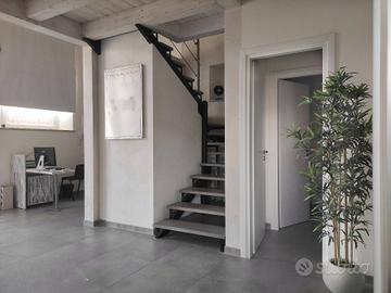 Il piano terra è composto da ingresso di 5,84 mq, caratterizzato da uno spazio a doppia altezza, due uffici, una sala riuniuni, un bagno e un ripostiglio, mentre al primo piano abbiamo una sala di attesa, tre uffici e un bagno.