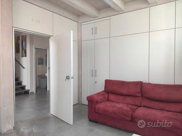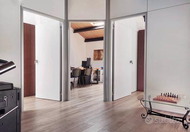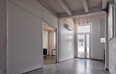 La suddivisione interna in stanze è stata realizzata attraverso un sistema di pareti divisorie appositamente pensate per uffici e riposizionabili, qualora le esigenze di spazio dovessero cambiare. Limmobile è autonomo e pensato per offrire un ambiente di lavoro funzionale e confortevole con travi a vista dal suo interno.