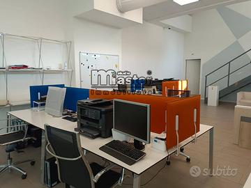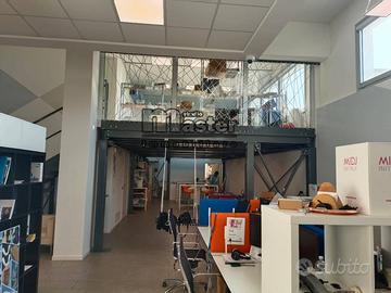 L'ufficio è disposto su 2 livelli di con una parte soppalcata di 45 mq., 2 bagni e un magazzino di 12 mq.