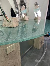 È un tavolo da salone di parrucchiere con ripiano in cristallo, due colonne di marmo per base, poggiapiedi in entrambi i lati, prese per la corrente dirette vicino al tavolo con aggiunta di 4 specchi ovali con base di marmo