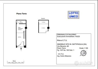 Unità immobiliare, adibito ad uso commerciale sito al piano terra, con ingresso da via Olevano, 60 del Comune di Battipaglia composto da un locale di circa 24 mq di superficie commerciale lorda compreso un locale bagno. L'immobile è arredato ad uso commerciale, è a pianta regolare di forma rettangolare con ingresso garantito con vetrata di ingresso e nella parte opposta all'ingresso vi è un locale bagno di circa 3.0 mq con altezza di 2,3 m. L'immobile risulta soppalcato per circa metà della sua superficie con una altezza residua di 2,0 m nella parte inferiore e 1,90 in quella superiore e risulta identificato al NCEU del Comune di Battipaglia al Fg. 18 P. lla 165 Sub 1, Cat. C/6, Classe 10, Piano T, Sup. cat. 21 mq, Rendita € 49,06.