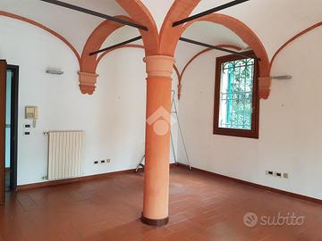 Via Ferrarese - Adiacenze Tecnopolo. In villa ristrutturata, proponiamo ufficio al piano terra composto da suggestivo open space colonnato con soffitti a volta, più ulteriore vano riservato e doppi servizi. Soluzione luminosa e silenziosa. Grande comodità di parcheggio: giardino privato pavimentato per tre auto, più due posti assegnati in cortile interno. Autonomo, cablato, comodo alla Tangenziale. Già libero. Rif. 1325