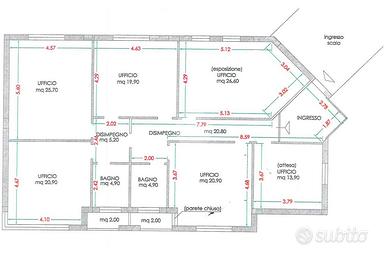L'ufficio, situato al secondo ed ultimo piano, è così suddiviso: sei ampi ambienti ad uso ufficio, corridoio, disimpegno, due servizi e balcone.