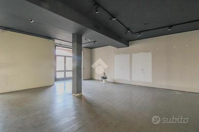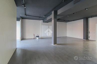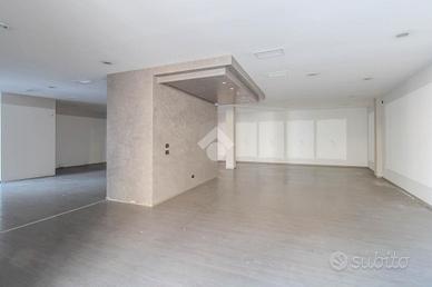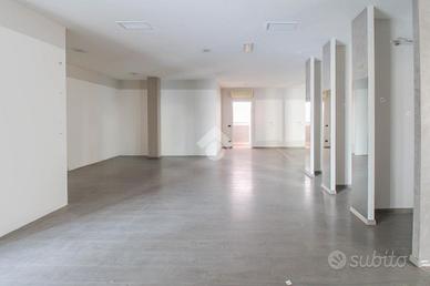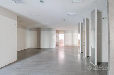 La soluzione proposta in locazione ha una superficie che misura nella sua totalità 470 metri quadrati. Internamente l'immobile è caratterizzato da due ampi ambienti, resi molto luminosi grazie alla presenza di quattro vetrine con affaccio su strada. L'ufficio è dotato degli impianti elettrico, di illuminazione, di allarme, di riscaldamento e di condizionamento. A completare la soluzione è la presenza di due servizi igienici privati e di circa 190 metri quadrati di magazzino, posto al piano interrato e accessibile tramite scale.
